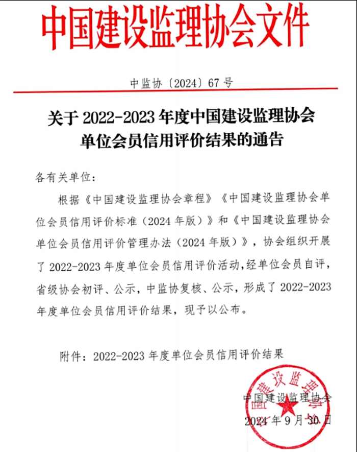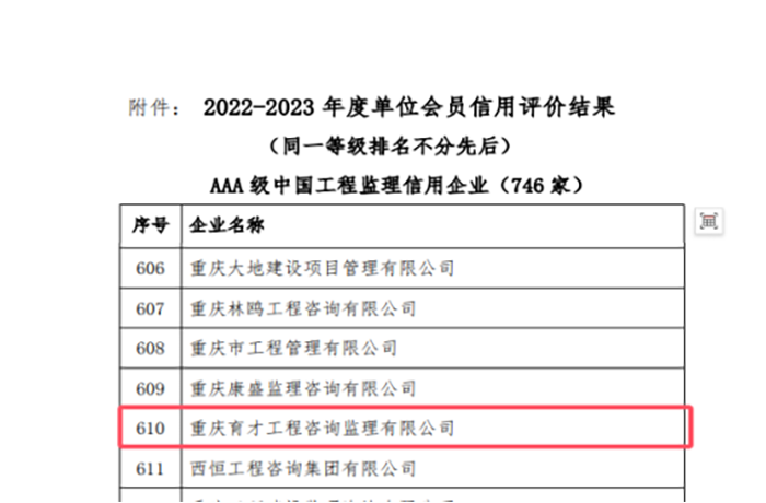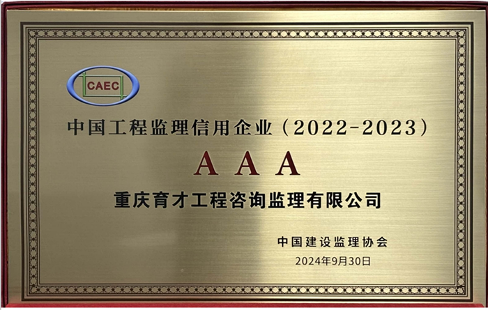 近日,中國建設監(jiān)理協(xié)會揭曉了《關于2022-2023年度中國建設監(jiān)理協(xié)會單位會員信用評價》的結果,重慶育才工程咨詢監(jiān)理有限公司憑借優(yōu)良的企業(yè)信譽與過硬的實力,榮獲中國建設監(jiān)理協(xié)會頒發(fā)的“AAA級中國工程監(jiān)理信用企業(yè)”稱號!